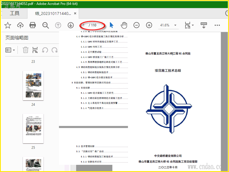 pdf共110页 佛山市富龙西江特大桥工程01 合同段 项目施工技术总结 2023.10 (包含完整斜拉桥UHPC桥面板施工) 富龙西江特大桥桥梁全长1770.6m , 桥跨组合为( 11 × 29.6+3 × 25+3 × 30 )m+(69+176+580+176+