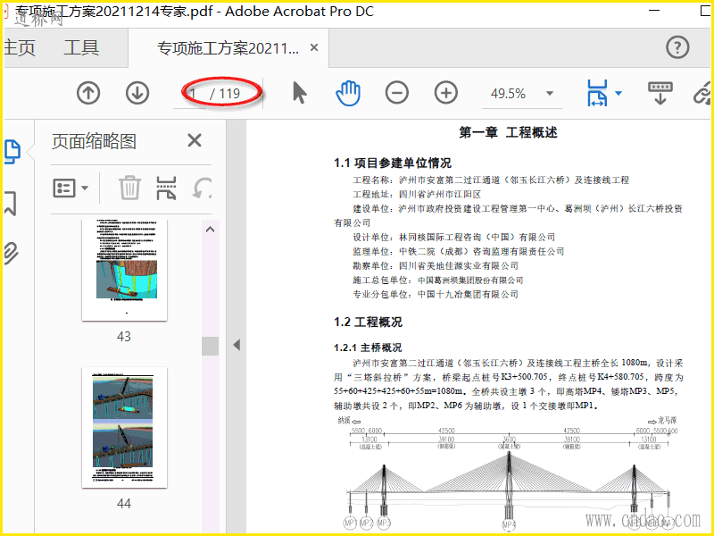 泸州市安富第二过江通道(邻玉长江六桥)及连接线工程主桥全长 1080m,设计采用“三塔斜拉桥”方案,桥梁起点桩号K3+500.705,终点桩号