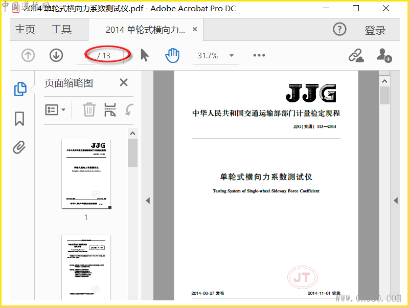 JJG(交通) 113-2014 单轮式横向力系数测试仪