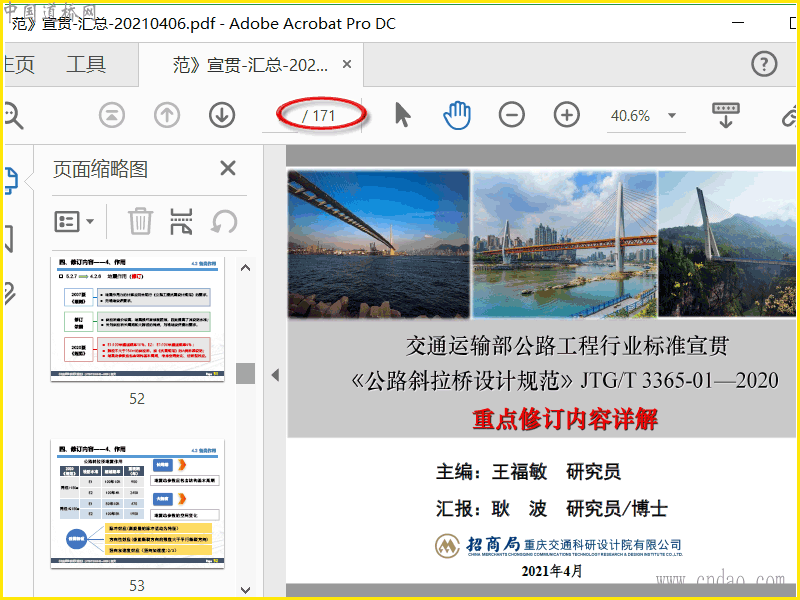 2021年4月招商局重庆交通科研设计院《公路斜拉桥设计规范》JTG/T3365-01-2020宣贯的PPT文件,pdf共171页