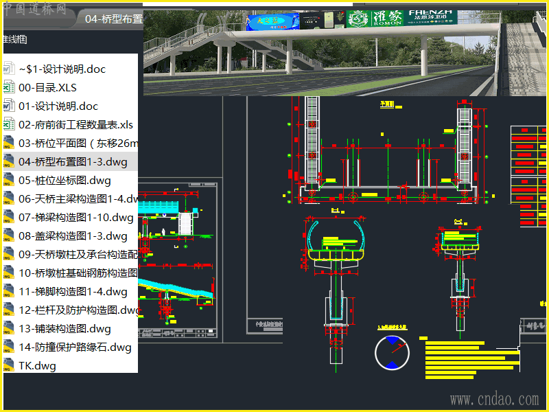 为三跨连续钢结构梁桥,跨径组合为(14.25+19+14.25)米,全长47.5米。天桥共设置四部钢结构梯道,东北侧和西南侧两条梯道考虑自行车推行,坡道梯度为1:4,其它两道梯度为1:2.62。